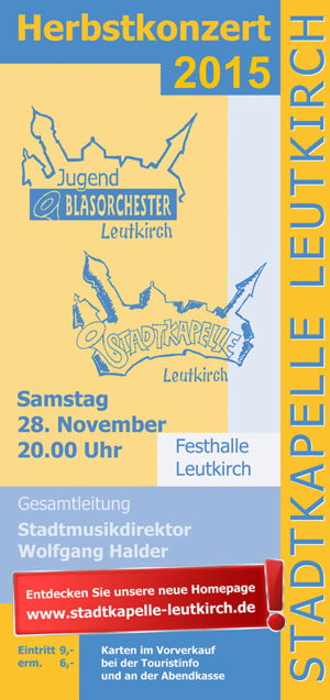 Das jährliche Herbstkonzert in der Festhalle in Leutkirch gehört zu den Höhepunkten des Terminkalenders der Stadtkapelle. Jedes Jahr am Samstag vor dem ersten Advent werden konzertante Blasmusikwerke von der Stadtkapelle und dem Jugendblasorchester aufgeführt. Zu den diesjährigen Höhepunkten gehören unter anderem Werke wie die Star Wars Saga von John Williams, die Ouverture Allemande von Thomas Doss und die Second Suite for Band von Alfred Reed.