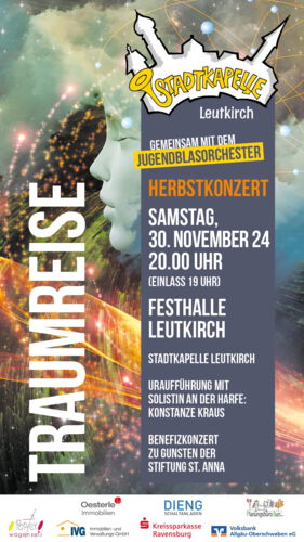 Wir möchten Sie hiermit herzlich zu unserem diesjährigen Herbstkonzert am Samstag, den 30. November 2024 um 20:00 Uhr in die Festhalle Leutkirch einladen.