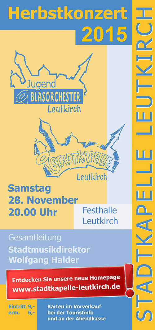 Das jährliche Herbstkonzert in der Festhalle in Leutkirch gehört zu den Höhepunkten des Terminkalenders der Stadtkapelle. Jedes Jahr am Samstag vor dem ersten Advent werden konzertante Blasmusikwerke von der Stadtkapelle und dem Jugendblasorchester aufgeführt. Zu den diesjährigen Höhepunkten gehören unter anderem Werke wie die Star Wars Saga von John Williams, die Ouverture Allemande von Thomas Doss und die Second Suite for Band von Alfred Reed.